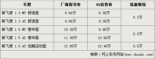 新飛度是廣州本田去年7月份上市的車型,其是廣州本田經濟型轎車的主力軍,外形比起老款飛度更加前衛更加時尚,創新的動感另類駕駛艙更是一大亮點。近日據網上車市網站價格系統監測顯示,新飛度全系最高優惠金額為5000元,具體詳情請看下表: