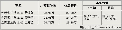 起亞進口SUV全新索蘭托于7月29日正式上市銷售,前期推出了三款車,售價為22.98萬——26.78萬元。據網上車市價格監測系統顯示:目前北京地區進口起亞4S店內無現車銷售,急于提現車的消費者在店內購買1.2萬元的裝飾后,即可在本周提到愛車,而預訂則需要等待一個月左右。