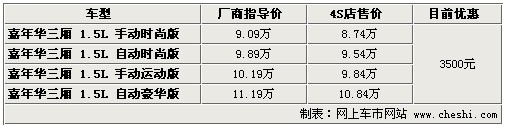 據(jù)4S店銷售人員介紹:目前新嘉年華三廂現(xiàn)車較為充足,顏色比較齊全。據(jù)北京某家4S店透露,目前新嘉年華三廂最高可優(yōu)惠3500元現(xiàn)金,最低配置車型僅需8.74萬元。由于三廂車型銷量較之兩廂車型要少很多,所以目前現(xiàn)車較多,購買者并不多,建議著急提車的朋友可盡快與店內(nèi)聯(lián)系。