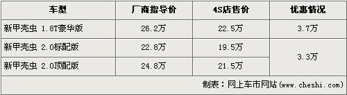 據4S店銷售人員介紹:目前甲殼蟲全系有最高3.7萬元的優惠。經3.7萬元優惠后,1.8T豪華型售價從26.2萬元下降到了22.5萬元。2.0L的標配版和頂配版經3.3萬元優惠后,售價分別將為了19.5萬元和21.5萬元。