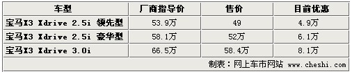 繼X5成功的引進我國后,寶馬又將其X系列旗下的緊湊型SUV寶馬X3帶到了中國。目前國內(nèi)在售的X3 2.5Si與X3 3.0si是在X3基礎(chǔ)上衍生而成的運動版車型,將寶馬特有的靈敏性與運動型多用途車的廣泛實用性完美結(jié)合。近日據(jù)網(wǎng)上車市價格數(shù)據(jù)監(jiān)測顯示,寶馬X3全系最高有近8.1萬元的現(xiàn)金優(yōu)惠,具體詳情請看下表: