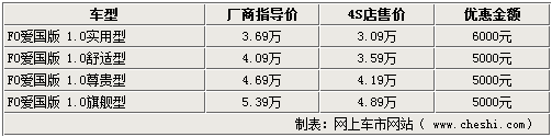 據(jù)比亞迪汽車4S店銷售人員介紹,比亞迪F0愛國版igo系列車型的現(xiàn)車并不是很齊全,實(shí)用型和舒適型都有現(xiàn)車,尊貴型和旗艦型則需要預(yù)訂,大概10-15天即可提車。而目前1.0L實(shí)用型和舒適型都有現(xiàn)車,其中實(shí)用型可以優(yōu)惠6000元,優(yōu)惠后售價已經(jīng)接近3萬;而其他車型只可以優(yōu)惠5000元現(xiàn)金。