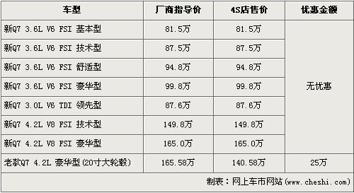 2009年9月4日,一汽-大眾奧迪銷售事業(yè)部宣布新奧迪Q7正式上市,在原有3.6 FSI、4.2 FSI兩款汽油直噴發(fā)動機基礎(chǔ)上奧迪首次將全球領(lǐng)先的3.0 TDI渦輪增壓柴油直噴發(fā)動機引入中國,使新奧迪Q7形成了包括3種排量7款車型的強大產(chǎn)品陣容,價格區(qū)間為81.5至165萬元。近日,奧迪Q7全系出現(xiàn)了最高25萬元的優(yōu)惠,具體價格行情請看下表: