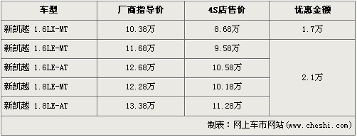 據4S店銷售人員介紹,新凱越分為1.6L與1.8L兩種排量車型,目前新凱越除了入門級的1.6LX-MT版優惠1.7萬外,其他車型均優惠2.1萬元。經優惠后,全系的最低價格降到了8.68萬元。銷售人員還介紹,新凱越店內現車比較充足,消費者挑選的空間較大。