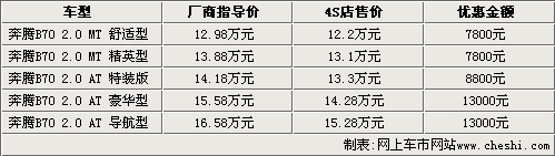 據一汽奔騰汽車4S店銷售人員介紹,目前09款奔騰B70現車顏色不全,主要以銀色車型為主,目前手動擋車型只能優惠7800元;上市不久的自動特裝版能夠優惠8800元;而另外兩款自動擋車型現在能夠優惠到13000元,如果到店詳談還能有更多的優惠政策。2010款奔騰于九月十六日正式推出,售價在12.98萬至18.88萬元之間,現在店內現車比較充足,但是沒有任何現金方面的優惠,商家在購車時贈送車輛保險。