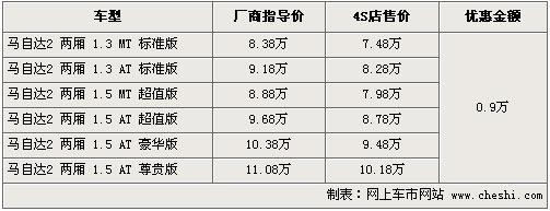 馬自達2系列是日系A0級車中的一款優秀小生,結合了良好的安全性、舒適性及燃油經濟性表現,非常適宜首次購車的用戶。目前馬自達2兩廂最高可以優惠現金0.9萬,具體行情參考如下: