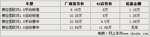 東風(fēng)悅達起亞旗下的首款兩廂轎車—賽拉圖歐風(fēng),憑借著歐洲車型的設(shè)計理念和圓潤飽滿的外形,得到消費者的關(guān)注。近日記者了解到:賽拉圖歐風(fēng)將推出1.5排量車型,屆時1.6車型將全部停產(chǎn)。根據(jù)網(wǎng)上車市價格監(jiān)測系統(tǒng)顯示,目前銷售的賽拉圖歐風(fēng)最高優(yōu)惠1.3萬元。具體車型見下表:
