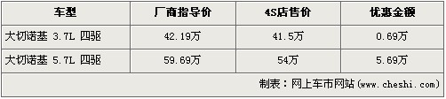 據經銷商銷售人員介紹,大切諾基3.7L車型的優惠金額僅為6900元,而高排量的5.7L車型優惠金額達到了5.69萬元,達到了全系的最高。在售的Jeep-大切諾基共分為3.7L四驅和5.7L四驅兩個車型。3.7L四驅型經6900元優惠后,售價降為了41.5萬元。而排量稍大的5.7L四驅型經5.69萬元優惠后,售價降為了54萬元。