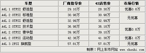 據北京一汽奧迪經銷店銷售人員介紹:目前A4L全系現車比較齊全,除1.8TFSI及3.2L車型現車較少以外,其余車款均有現車。現車顏色主要有銀色、灰色、紅色等,如預定其他顏色車型需預定,預定最少等20天,最長等待1個半月。1.8TFSI及3.2L車型等待時間較長,需等3個月時間。優惠方面,目前全系最高優惠1萬元,其余車型均有8000元左右的優惠幅度。現購車取消了加價,并還有一定幅度的優惠,此時購車比較劃算,喜歡的消費者請及時與店內聯系。