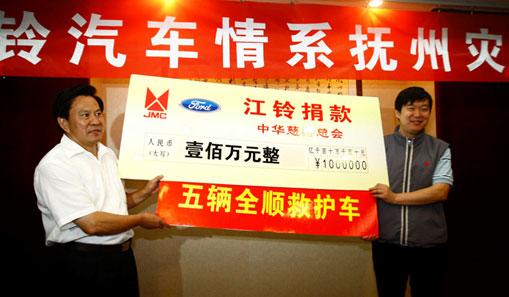 江鈴股份公關及法務部部長丁朝陽代表江鈴汽車股份有限公司將5輛福特全順救護車鑰匙和100萬元人民幣交給撫州市慈善總會代表撫州市市委常委、常務副市長謝發(fā)明手中