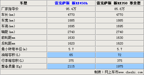 雷克薩斯新RX350和RX450h的售價相差了將近10萬元。兩款車型的車身尺寸完全一樣,軸距也都到達到了2740mm,這些數據都確保了它們擁有著寬敞的內部空間。兩款車型的最小轉彎半徑都是5.7m,確保了它們在狹窄道路上的通過性能。在油箱方面,由于RX450h為混合動力車型,所以油箱容積要比汽油版車型小,只達到了65升。但是由于RX450h自身攜帶了大通量電池和電動馬達,所以自身重量要高于汽油版車型。