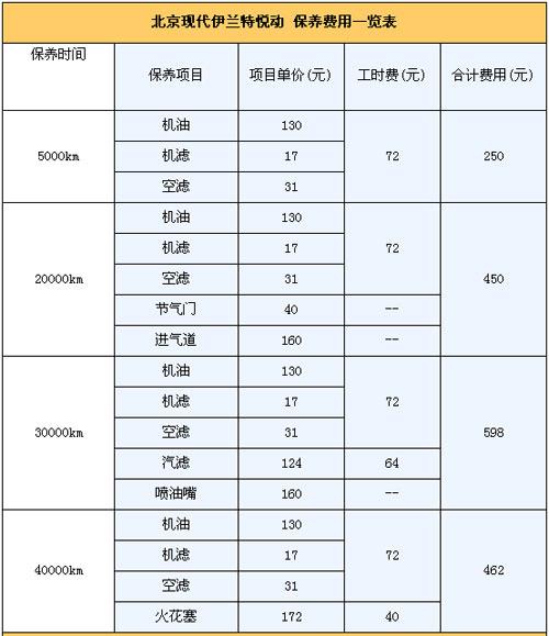 4.保養費:悅動的首保為5000km,以后每次的保養間隔為5000km。保修政策為2年/6萬公里保修(以先到為準)。第二次的10000km保養和首保內容相同。那么如果一年行駛2萬km,悅動一年要做四次保養。由下表可知其除了第一年,以后每年的保養費用1500元。