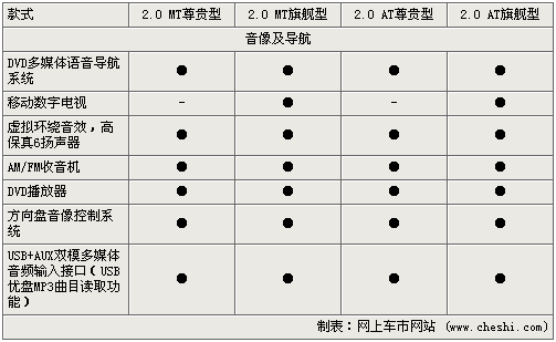 在音像及導航配置方面,差別同樣不大,尊貴型與旗艦型的差別只是移動數字電視,其他如DVD導航及音響播放器、6喇叭揚聲器等,應該說是非常齊備的音響系統了。