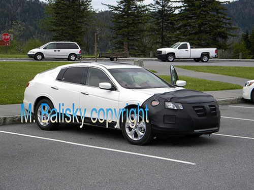 從諜照上看,雅閣Crosstour的車頂線條與在本屆紐約車展上亮相的謳歌ZDX概念車非常相似,車頂擺脫了傳統(tǒng)的“兩柱式”設(shè)計,A柱與C柱被視覺沖擊感極重的一體式“溜背”車頂設(shè)計所取代。雖然此設(shè)計創(chuàng)新力極佳,但是后尾急降的弧度不知道會不會另后排乘客感覺到頭部空間不夠。