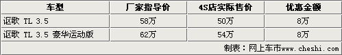 09新款的謳歌TL在去年12月份正式進入國內市場銷售,相比之前老款車型,09款在外觀、性能、排量上均有不同程度的提升。近日謳歌為了可以更好的適應中國市場的需求推出了TL豪華運動版車型,售價62萬元。與此同時根據網上車市價格監測系統顯示,目前購買TL均可以得到8萬元的現金優惠,其中也包括剛剛推出的豪華運動版。具體車型售價見下表: