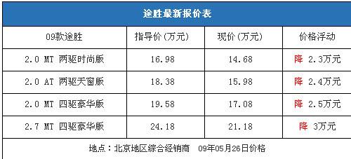 近期國內市場SUV車型再次升溫,4月份銷量較上月有大幅增加,其中途勝4月份銷量高達4050輛,排在SUV銷量榜第四位。我們從北京地區的一家北京現代綜合經銷商處了解到,09款途勝全系車型的優惠在2.3-3萬元區間,價格和三月初基本相同,只有2.7手動四驅豪華型的價格比月初下降了2000元,優惠金額增加到了3萬元。以下是09款途勝最新詳細報價表: