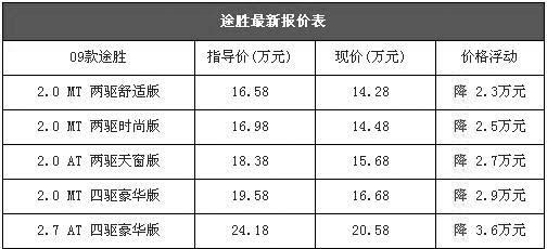 我們近日從北京地區(qū)的一家經(jīng)銷商處了解到,在穩(wěn)定了一個季度之后,途勝的優(yōu)惠再次增加,目前09款途勝全系車型的優(yōu)惠增加到2.3-3.6萬元區(qū)間,平均價格比一個月前下降了3000元左右,性價比再次得到提升。以下是09款途勝在北京地區(qū)綜合經(jīng)銷商處的最新報價表: