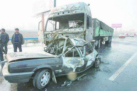據(jù)大貨車駕駛員呂某介紹,事故發(fā)生前,他在正常行駛,前面的轎車突然急剎車。“我在幾十米遠(yuǎn)處就使勁踩剎車,可是不管用。”呂某猜測(cè),被追尾轎車突然剎車,估計(jì)是錯(cuò)過了下道口,試圖掉轉(zhuǎn)車頭往回走。“兩車相撞后,立即起了大火。”呂某說,他和副駕駛員跳車逃生,小轎車內(nèi)兩人被燒死。