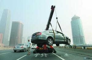 吊車將事故車輛吊起。昨日上午7時30分許,兩輛轎車在東三環(huán)主路國貿橋上發(fā)生碰撞,一輛轎車仰翻,事故造成1人輕傷。該路段堵塞近半個小時。本報記者 薛珺 巴士廣 攝影報道
