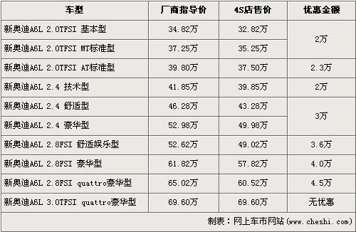 據4S店銷售人員介紹,目前奧迪A6L全系可以最高優惠4.5萬元。奧迪A6L全系分為2.0TFSI,2.4L,2.8FSI,3.0TFSI四種共10個車型,最低配的2.0TFSI基本型經2萬元優惠后售價從34.82萬元下降到了32.82萬元,而2.8TSI quattro豪華版經全系最高的4.5萬元優惠后售價也降到了60.52萬元。全系最高配的3.0TFSI quattro豪華版目前店內沒有現車,欲購買的消費者需要交1萬元訂金,約等3個月后方可提車。
