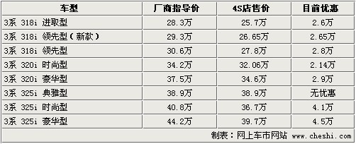據4S店銷售人員介紹:寶馬3系推出一款新318i領先型,目前318i領先型共有2款,但是配置有所不同。新款車型相比在售的30.6萬元的車型配置有所降低,但是相比318i進取型多了幾項實用配置,但優惠后的價格僅比318i進取型價格高了不足1萬元。目前寶馬3系318i全系無現車,預定需等到11月底、12月份才能到車,顏色為黑色。320i目前時尚型有現車,顏色為紅色,豪華型需預定。寶馬3系全系最高優惠4.5萬元,相對優惠價格較穩定。