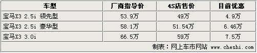 據4S店銷售人員介紹:目前寶馬X3全系3款車型全部有優惠,最高優惠7.5萬元。目前X3 2.5i豪華型與3.0i有現車,2.5i豪華型現車顏色有黑色、金色、銀色、灰色、白色,現車比較多顏色較齊全;3.0i車型僅有銀色現車。X3領先型預定需等到今年底活明年初,如果不著急購買的消費者可以等待。目前購買X3任何一款車型,均可獲得原車導航系統。