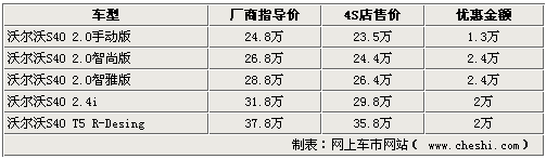 據4S店銷售人員介紹:目前S40系列車型較之前優惠幅度有所變動,最高降幅達2.4萬元。2.0升兩款自動版車型優惠2.4萬元現金,S40 T5渦輪增壓版車型及2.4i車型優惠2萬元。二手動版車型僅可優惠1.3萬元,且店內車型不全。到店詳談還有更多優惠余地。店內購車可送腳墊,除此之外無其他裝飾贈送。顏色方面,銀色、紅色車型現車相對較多,如預定其他顏色車型,需等待半個月至一個月時間,如著急用車的消費者請安排好提車時間。