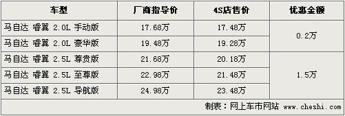 睿翼是一汽馬自達旗下的主力車型,憑借著運動性的流線型外觀和精準的操控性贏得了消費者的青睞。目前一汽馬自達睿翼共五款車型分別覆蓋了2.0和2.5排量。根據(jù)網(wǎng)上車市價格監(jiān)測系統(tǒng)顯示:睿翼相比節(jié)前優(yōu)惠有所減少,近期最高優(yōu)惠1.5萬元。具體車型行情如下: