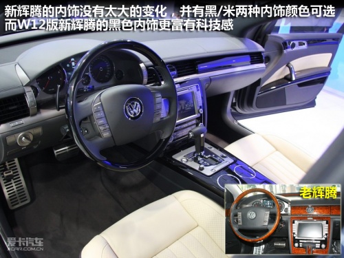 與它經過少許修改的外觀不同,新輝騰的內飾幾乎沒有變化,整車主要有兩種配色:原木色+米色與黑+銀色可選。車內的設計、布局與老款車型完全相同,新輝騰W12版車型采用黑銀色內飾+米色座椅,與典雅的V8車型所采用的原木色相比更富有冷冷的科技感。