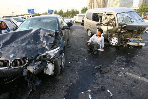 面包車旁,一輛黑色寶馬轎車同樣損失慘重——正副駕駛位置的安全氣囊雙雙彈開,轎車前保險杠、引擎蓋、水箱等部件被撞毀。事發(fā)時,寶馬車還蹭住了身旁一輛捷達[綜述 圖片 論壇]車。“當時,面包車沿中州大道自南向北行駛,走到這兒時,不知道啥原因突然撞開護欄,沖到對面車道。”捷達車司機說,他當時駕車行駛在寶馬車右后側(cè),發(fā)現(xiàn)險情后,兩車紛紛向右打方向避讓,但最終還是沒能避開。