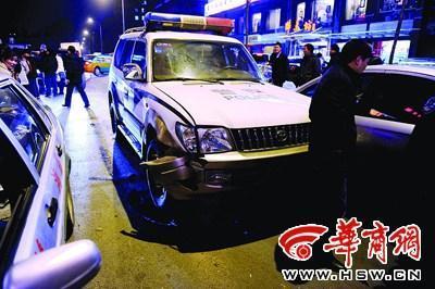 昨日下午5時30分,高新四路通往西大桃園校區的路上,一輛制式警車20米內連撞4輛轎車。不少目擊者懷疑司機喝了酒。
