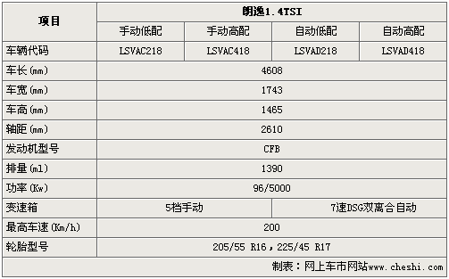 朗逸1.4TSI首推四款車型 參數、配置曝光