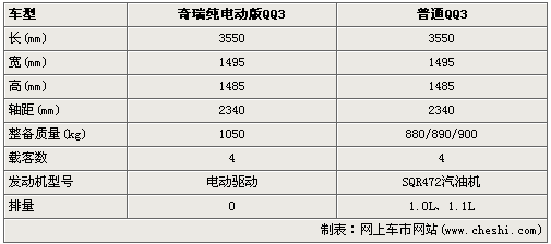 從基本參數來看,純電動版QQ3與普通版QQ3相比,車身尺寸沒有變化,不過在車重上增加了不少,這可以看出電動模塊還是比較重的,當然比較特別的電動QQ3絕對零排放,不過對于電動模塊的參數暫時還沒有,有待進一步的消息發布。