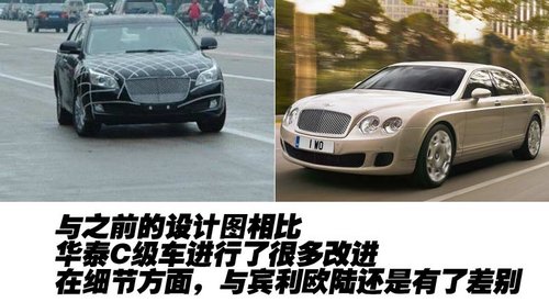 與之前曝光的華泰B級車設計草圖相比,這款新車的實車確實有了很多改變,除了前臉仍與賓利非常相似以外,車身的很多細節部分的設計都有了全新的變化。如果說吉利卓越GE與勞斯勞斯幻影的相似度能達到80%,那么華泰的B級車山寨賓利歐陸飛馳則顯得小巫見大巫了。