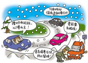 對(duì)于雪地的駕駛技巧,交警部門提醒車主,關(guān)鍵是以“慢”為主,并與前車保持足夠的剎車距離。然而,路況的復(fù)雜,讓很多駕駛員在發(fā)生側(cè)滑時(shí)感到緊張。“如果車輛打滑,方向盤要順著打滑方向輕輕地轉(zhuǎn),待車輪回正后,再輕輕地踩剎車。”“關(guān)鍵是要慢,平穩(wěn)地減速及輕踩剎車,絕對(duì)不要在冰雪濕滑的路面上猛起步,或緊急剎車。”杭城資深出租車司機(jī)師傅們紛紛提供雨雪天氣駕駛竅門。