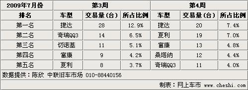 今日,筆者從北京中聯汽車交易市場了解到,隨著二手車市場淡季持續深入,二手車收購和銷售放緩趨勢明顯,并呈現出兩級分化趨勢,中低端車銷量趨于良好,高端車滯銷明顯。上周的二手車交易量比6月份有所減少。根據7月份最后兩周的銷量排名來看,實用、經濟型轎車還是受到消費者的追捧。詳見下表:
