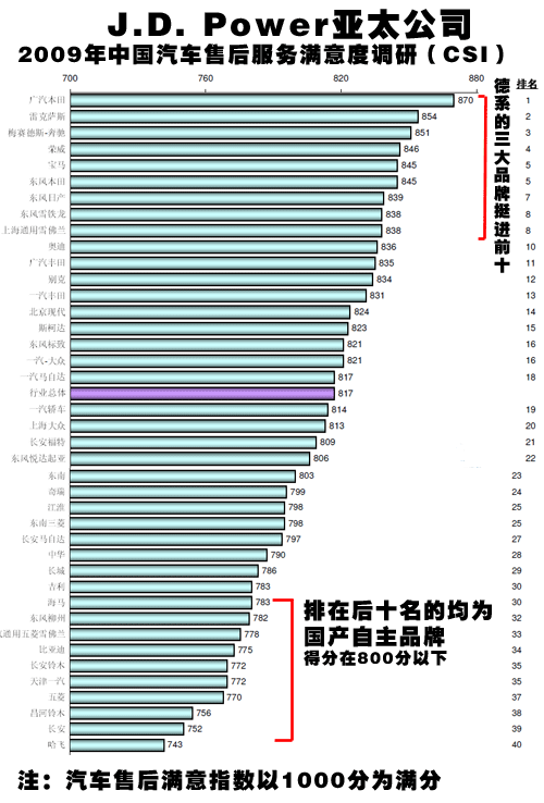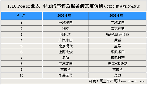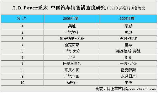 通過以上08年度與09年度的J.D. Power(亞太公司)中國汽車銷售滿意度前10名的對比我們不難看出,合資品牌還是占據了主要的位置,但日系廠商的排名有所下降。08年度的第一名奧迪意外的被自主品牌榮威所代替,寶馬提升至第4名,梅賽德斯-奔馳落后2名。而中華則闖入前10名,替代了斯柯達的位置。
