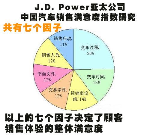 J.D. Power亞太公司在中國開展的汽車銷售滿意度指數研究共有七個因子決定了顧客銷售體驗的整體滿意度;根據重要性排列,分別是:交車過程、交車時間、經銷商設施、銷售人員、書面文件、交易條件和銷售啟動。