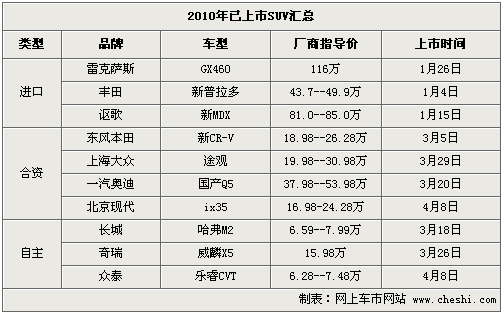從年初至今,已經上市的SUV車型達到了10款之多,而3月上市的就占到5款。其中上海大眾途觀在上市預售首月訂單就突破了4萬輛的;隨后上市的國產奧迪Q5訂單已經排到明年,目前購買這兩款車仍需要加2.5萬-3萬元才能提到現車。而4月8日上市的iX35則又將在日系車市場掀起一股搶購熱潮。