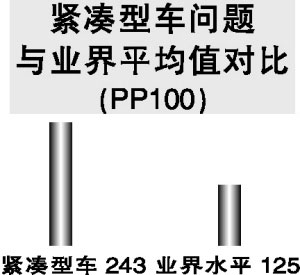 在細分市場方面,緊湊型車車主遇到的問題比行業平均水平高出80%以上,比高檔緊湊型車用戶的問題高出58%。幾乎20%的緊湊型車車主都投訴說他們遇到的問題比預期的要多,而整個業界有此抱怨的客戶也不過是10%。除此之外,緊湊型車細分市場中遇到的產品缺陷和功能障礙數量(243 PP100)幾乎是業界總體水平的兩倍(125 PP100)。