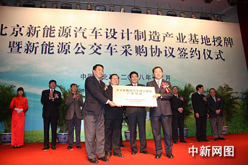 中新網(wǎng)1月9日電 日前,北京新能源汽車設(shè)計(jì)制造產(chǎn)業(yè)基地授牌暨新能源公交車采購(gòu)協(xié)議簽約儀式在福田汽車舉行,國(guó)家科技部和北京市政府聯(lián)合向福田汽車授予了北京新能源汽車設(shè)計(jì)制造產(chǎn)業(yè)基地牌匾。