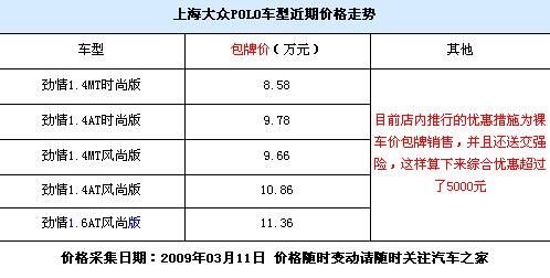 近期小型車市場可以說是大事不斷,峰范、嘉年華的先后上市都對這一市場的格局造成了一定的影響,而作為這一系列的主力車型之一的POLO車型也不甘示弱。近期,筆者通過深圳地區的上海大眾經銷商處了解到,目前POLO 勁情車型在深圳地區的優惠措施為裸車價包牌銷售,即相當于免除了購置稅、上牌費等一系列費用,并且還送交強險。具體詳情請見下表: