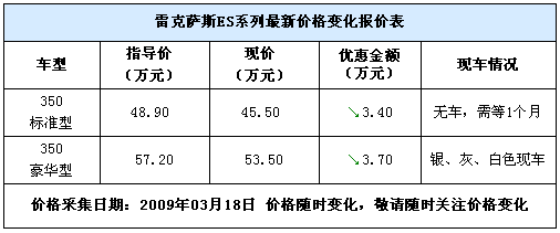 本周,編者聯系了上海和凌雷克薩斯4S店后了解到,現在該店雷克薩斯ES350有現車在售,可選車型僅為豪華型一款,現車有銀色,灰色和白色可選,標準款車型需提前1個月預定。價格方面,目前購買ES350最高可優惠3.7萬元,店方還有部分禮品相贈,詳細價格信息請見下表:
