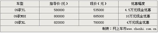 據謳歌經銷商表示,購買謳歌全系除了可以得到最高10萬元的價格優惠外,09款TL僅售53.5萬元。銷售人員還表示,現在謳歌系列車型顏色和車型齊全,可以給客人與最大的選擇空間!