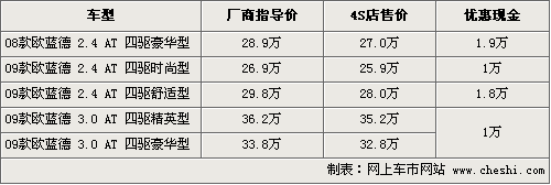 歐藍(lán)德是三菱引入國內(nèi)銷售的中型SUV車型,經(jīng)過09款小改款后,新款在外觀上增加了冷銀色換擋裝飾板,鍍鉻門內(nèi)把手,鍍鉻側(cè)窗裝飾物,鍍鉻尾門裝飾條等等,同時(shí)內(nèi)飾也有局部的變動(dòng)和提升。根據(jù)網(wǎng)上車市價(jià)格監(jiān)測(cè)系統(tǒng)顯示,目前歐藍(lán)德新老款車的優(yōu)惠幅度均在2萬元內(nèi),具體車型以及價(jià)格如下:
