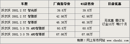 S80L加長版是沃爾沃專門為中國市場量身打造的一款全新豪華車,軸距加長140毫米,配置更加豪華,以滿足中國消費者的需求。國產(chǎn)加長版包括了2.5T和3.0兩個排量共5款車型。目前北京地區(qū)加長版車型現(xiàn)車緊缺,均需要提前預(yù)訂,具體行情如下: