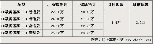 據北京地區廣州本田4S點銷售人員表示,目前銷售的08款奧德賽降幅又出現了新的優惠幅度。3月份左右,奧德賽全系優惠到了1.4萬元,而目前增加到了2.2萬元,直接增加8000元,最低價格僅售20.18萬元。現在購車除了可以得到現金優惠外,還可以得到商家贈送的原廠汽車裝飾。在現售的四款奧德賽車型中,普通版座椅為絨布材質,其他三款均為真皮材質,現車多以黑色和銀色為主。