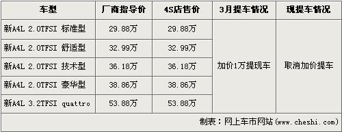 據(jù)北京地區(qū)奧迪經(jīng)銷店銷售人員介紹,近期購買奧迪A4L的消費(fèi)者可以以原廠商指導(dǎo)價(jià)購買,提現(xiàn)車不再需要多交1萬元現(xiàn)金。在售的新A4L分為5款車型,售價(jià)分別為:2.0T標(biāo)準(zhǔn)型為29.88萬元、2.0T舒適性為32.99萬元、2.0T技術(shù)型為36.18萬元、2.0T為38.86萬元、3.2Quattro為53.88萬元。銷售人員還介紹,新A4L的內(nèi)飾分灰色、黑色和米色三種,一般車色均配以米色和灰色內(nèi)飾,只有紅色車身的新A4L配以黑色內(nèi)飾,店內(nèi)只有紅色車型數(shù)量不多,欲購買其他顏色的消費(fèi)者需交定金1萬元,約等1個(gè)月后提車。