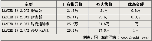 以純進口車身份銷售的三菱LANCER EX上市后,憑借上佳的質量及性能受到消費者喜愛。據網上車市網站得到的消息,近期北京各家進口三菱經銷商處已經出現了價格松動,除低配車型優惠仍為8000元外,2.0L高配車型以及頂配的2.4L豪華運動版車型均可給出10000元優惠。詳情如下: