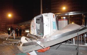 昨天(12月16日)凌晨1點,西二環主路官園橋北側,一輛白色三菱車行駛中突然失控,撞毀路側公交站亭后側翻。肇事司機系酒后駕駛。